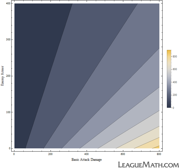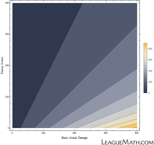 The x-axis is how much damage your basic attack would do to an unarmored target and the y-axis is how many points of armor your target has. So, we've eliminated attack speed by considering only a single attack, and we've eliminated the variables associated with critical strikes by rolling them into the damage (x-axis) before we plot.